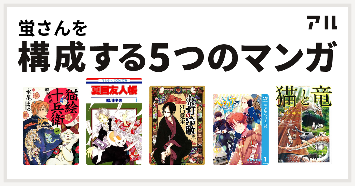 蛍さんを構成するマンガは猫絵十兵衛 御伽草紙 夏目友人帳 鬼灯の冷徹 ヘタリア World Stars 猫と竜 私を構成する5つのマンガ アル